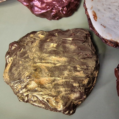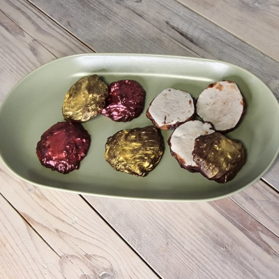Ich möchte Ihnen noch mein Lieblingsrezept mit Hirschhornsalz vorstellen. Es ist ein Lebkuchen-Rezept. Unten Oblaten, obenauf ein Schokoguss. Wenn Sie jetzt sagen: das ist doch nur für die Weihnachtszeit - dann habe Sie meine Lebkuchen für alle (festlichen) Anlässe noch nicht gesehen. Mit Gold- Silber- und Bronzelack aus Lebensmittelspray.